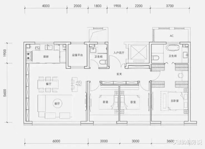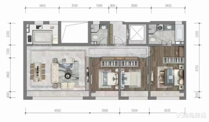 动静分离的布局,客厅开间5米7,包含两个套间。