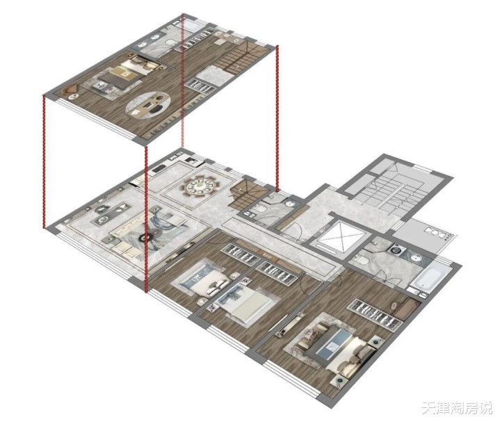 这个户型的玄机是客厅做双层挑空,能做出主卧套间,显示主人生活的私密感。